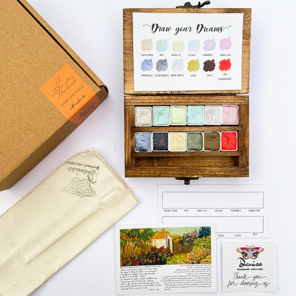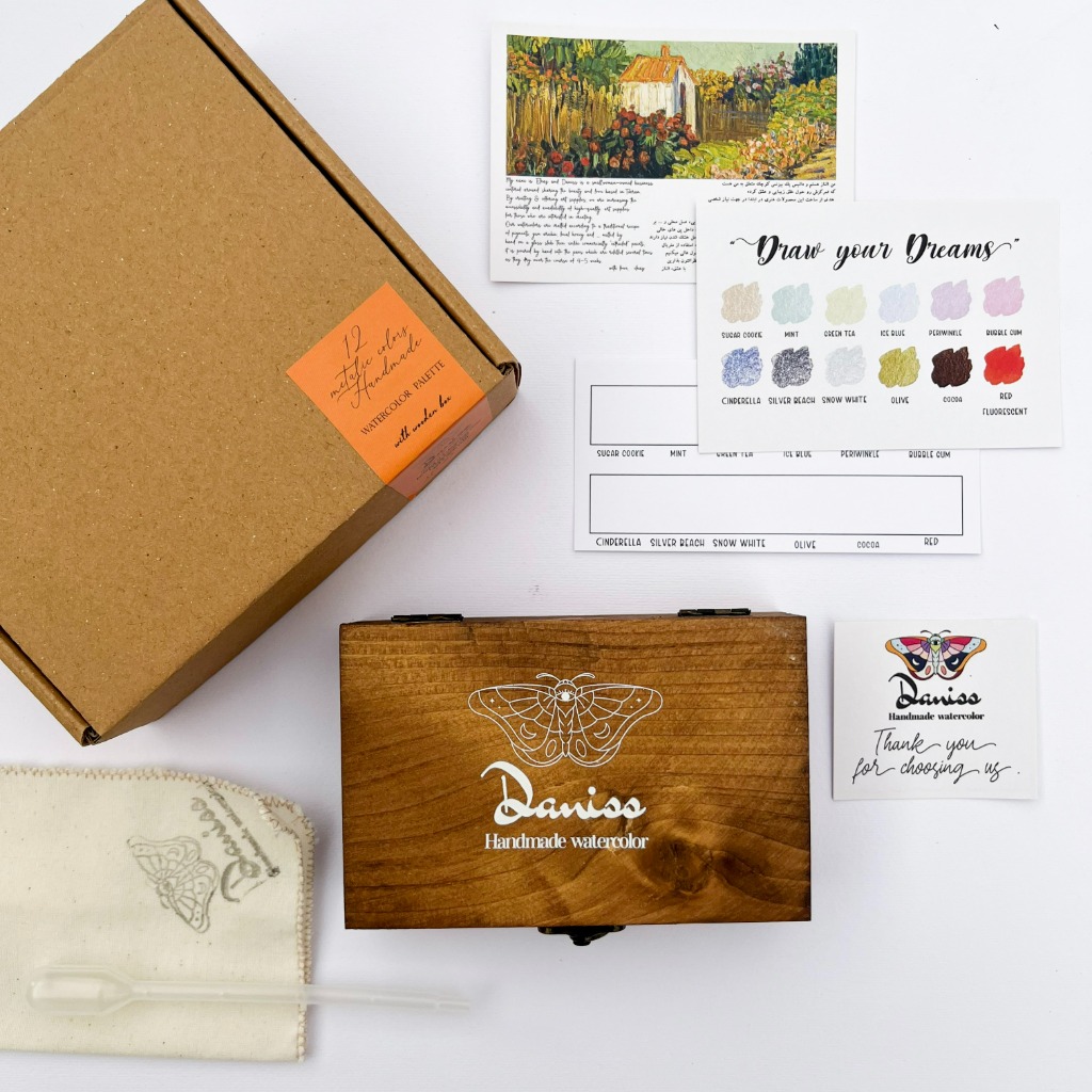 این آبرنگ در یک جعبه چوبی زیبا و مقاوم عرضه میشود که نهتنها از رنگها محافظت میکند، بلکه ظاهری لوکس و هنری دارد و برای هدیه دادن نیز بسیار مناسب است. در نتیجه، این بستهبندی حرفهای تجربهای متفاوت و لذتبخش از نقاشی با آبرنگ متالیک به شما ارائه میدهد. بستهبندی شامل یک دستمال نرم برای خشککردن قلممو و تمیز نگهداشتن فضای کار، و یک قطرهچکان کاربردی برای کنترل میزان آب و فعالسازی رنگهاست.