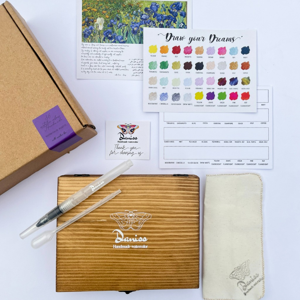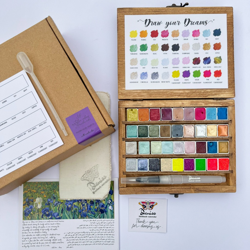 پیگمنتهای وارداتی با کیفیت بالا باعث شده رنگها شفاف، غلیظ و درخشان باشند. در نتیجه، رنگها به راحتی روی سطح پخش میشوند و نتیجهای لطیف، زیبا و حرفهای ایجاد میکنند که برای تکنیکهای دقیق و کارهای آزاد مناسب است. در ادامه، بستهبندی این مجموعه نیز یکی از نقاط قوت آن محسوب میشود: جعبهای چوبی مقاوم و زیبا که نهتنها از رنگها محافظت میکند، بلکه ظاهری لوکس و حرفهای به آن میبخشد. در ادامه، همراه پالت یک دستمال نرم و باکیفیت برای خشککردن قلممو و حفظ نظافت فضای کار و همچنین یک قطرهچکان ارائه شده که به کنترل دقیق میزان آب و صرفهجویی در مصرف رنگ کمک میکند.