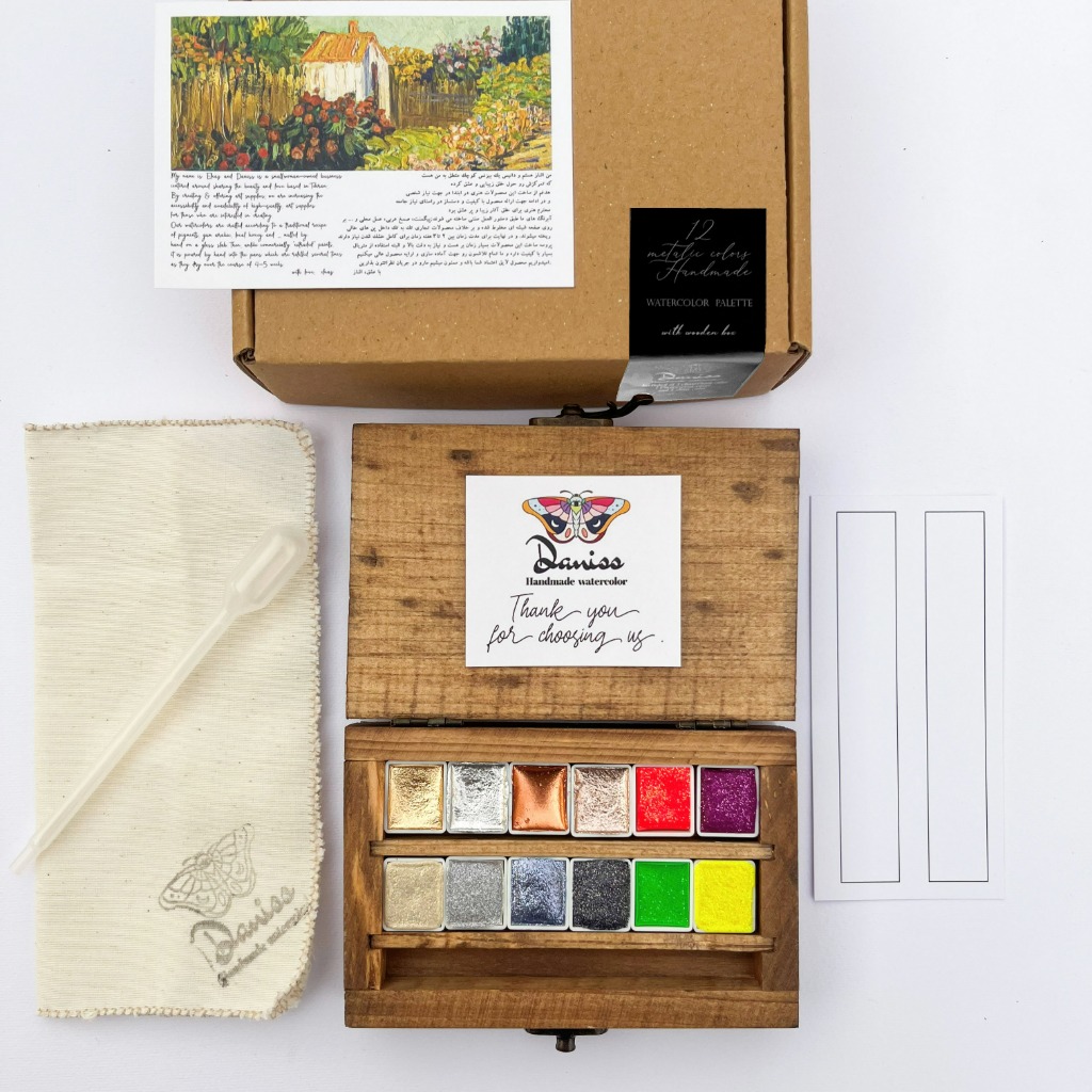 پیگمنتهای وارداتی و باکیفیت باعث شده رنگها شفاف، غلیظ و درخشان باشند. در نتیجه، رنگها به راحتی روی سطح پخش میشوند و نتیجهای لطیف و حرفهای به شما ارائه میدهند. در ادامه، بستهبندی شیک و لوکس این مجموعه با جعبهای چوبی مقاوم و زیبا، نهتنها از رنگها محافظت میکند، بلکه ظاهری حرفهای و متفاوت به آن میبخشد. در ادامه، همراه پالت یک دستمال نرم و باکیفیت برای خشککردن قلممو و همچنین یک قطرهچکان ارائه شده که کنترل میزان آب و صرفهجویی در مصرف رنگ را ممکن میکند.